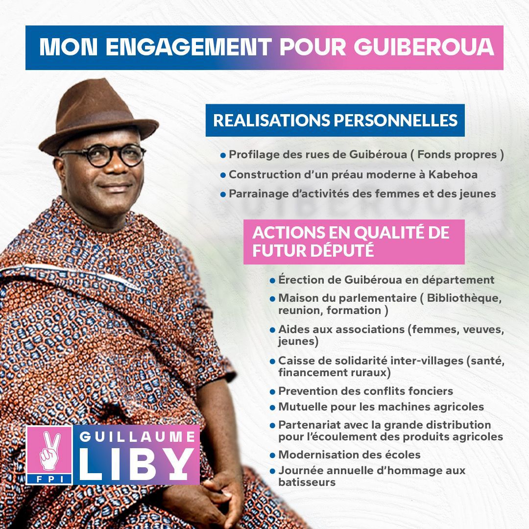 Le RHDP est porté par Madame le Ministre, une native de la région. Quant à moi, Guillaume Liby, je représente le FPI tout en portant les espoirs du PPA-CI et du PDCI.